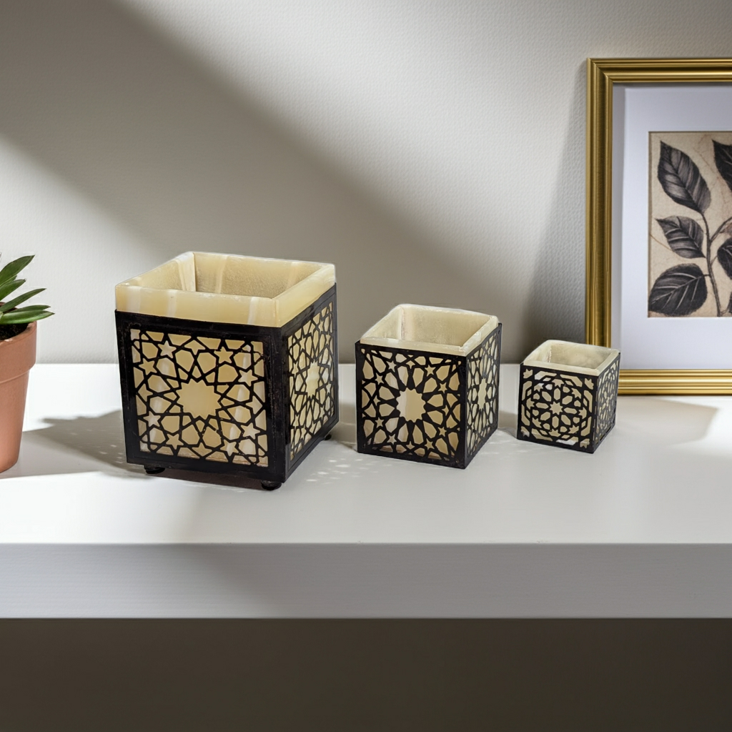 A beautiful nested set of three cube-shaped votive holders that blend classic Moroccan patterning with the warm glow of alabaster. Each brass frame features finely cut Moroccan motifs and houses a translucent alabaster liner — when lit, the alabaster gently diffuses candlelight for a soft, ambient glow. Perfect for mantels, side tables, dining tables, or gifting.