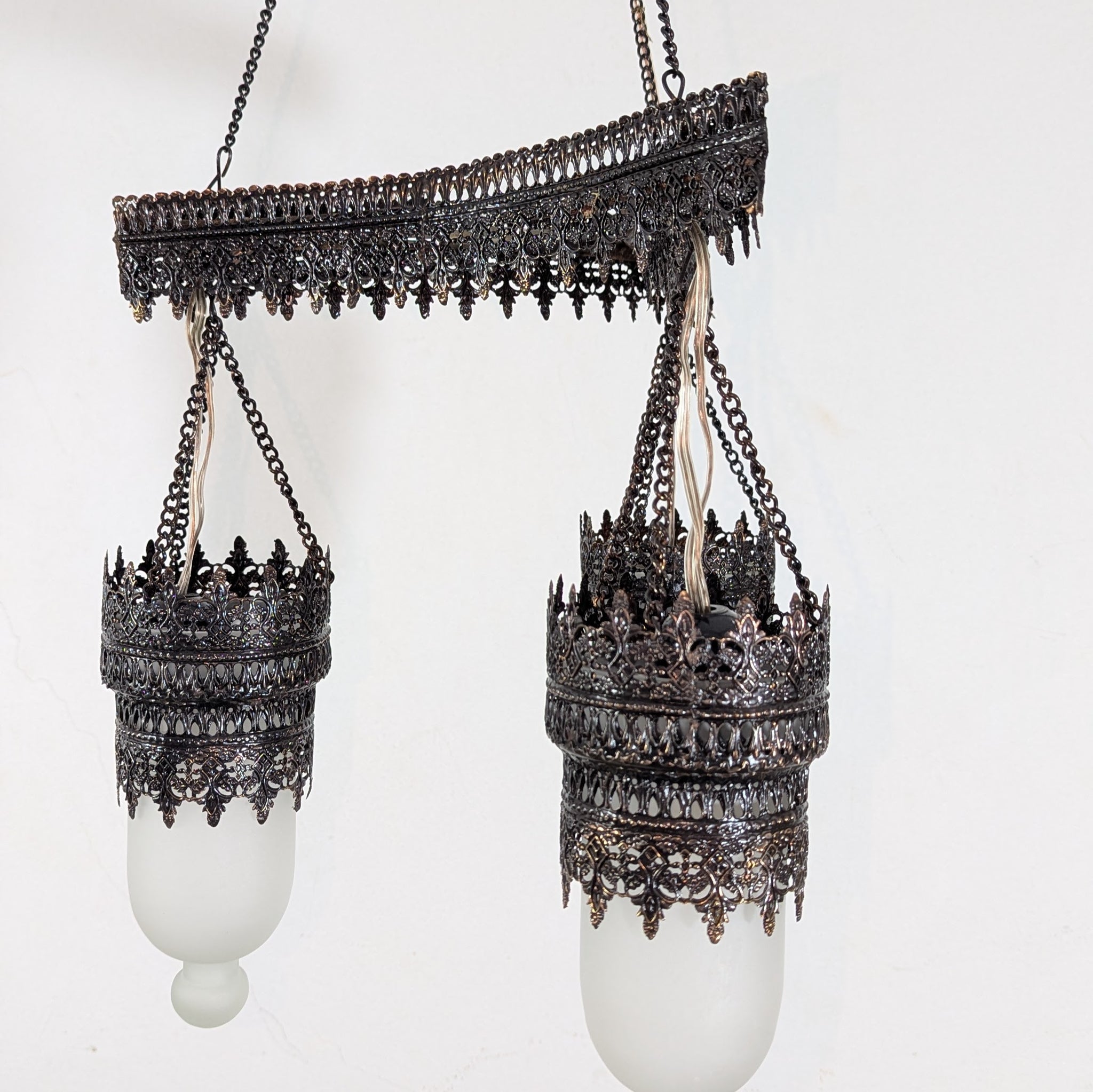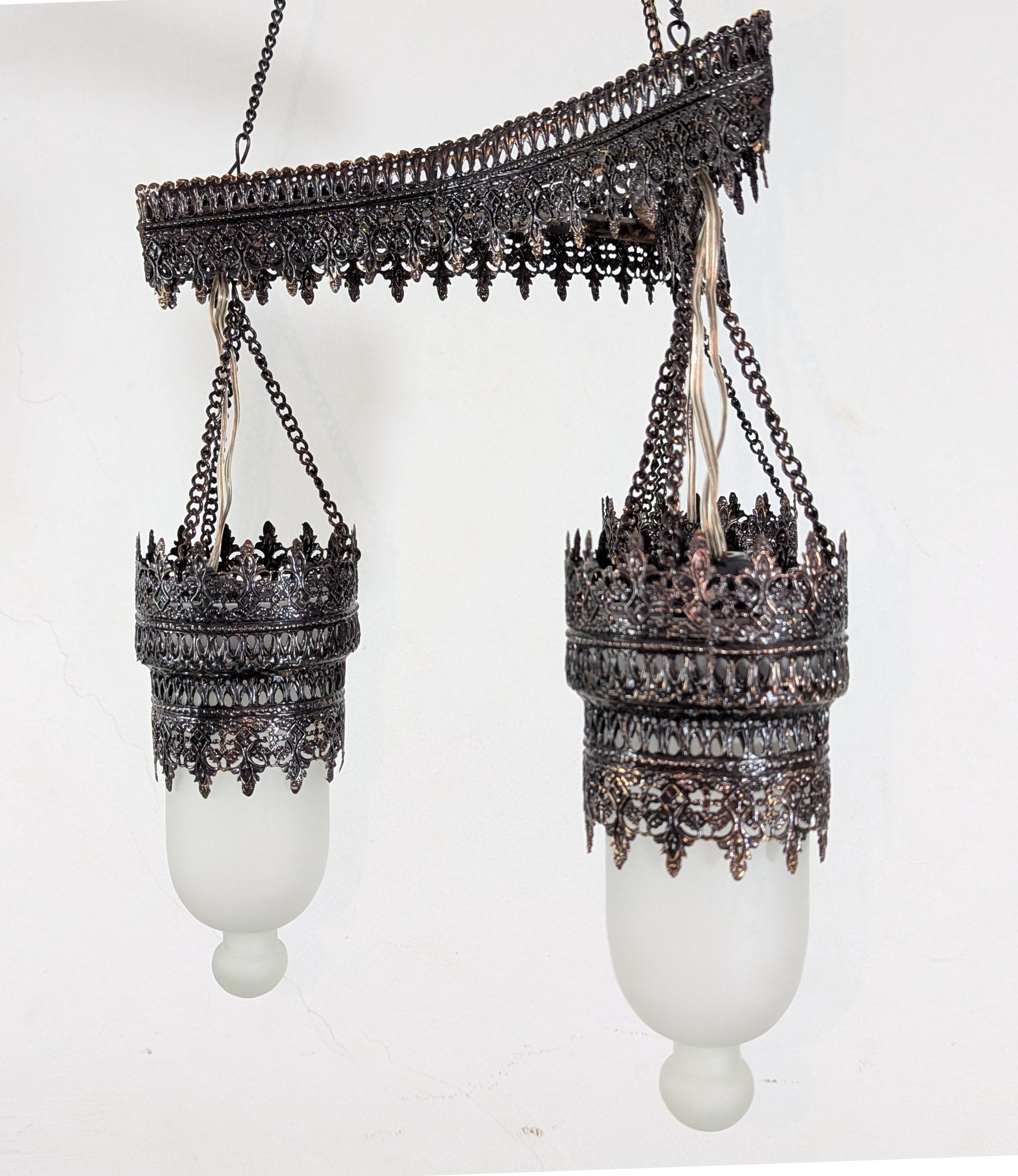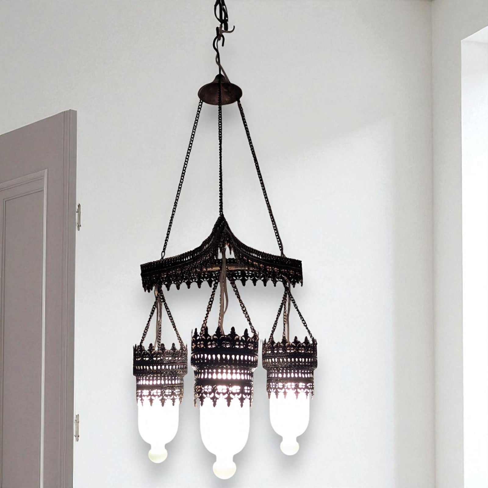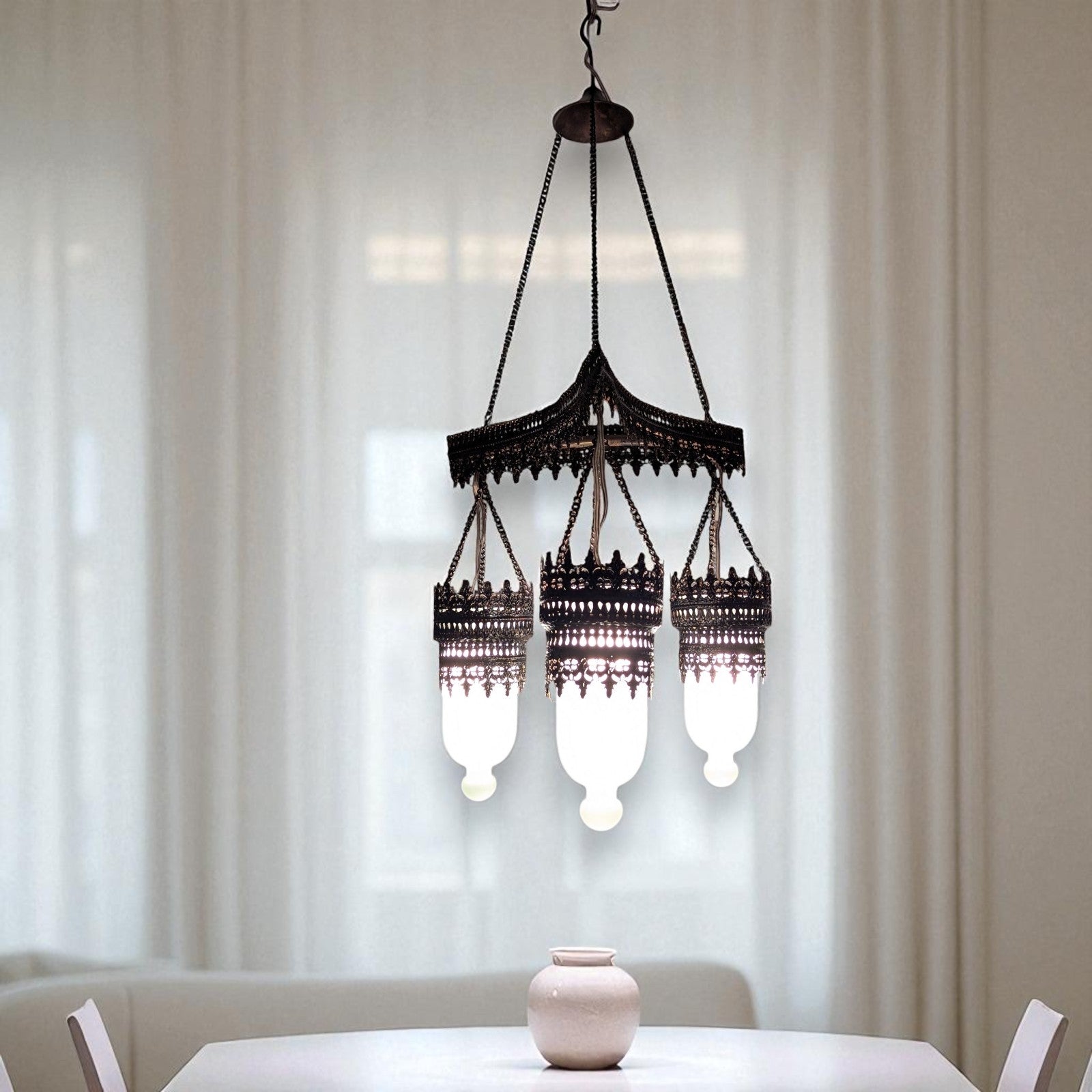 BR135 White Glass Triple Shades Chandelier Ornate Metal Filigree Vintage Look