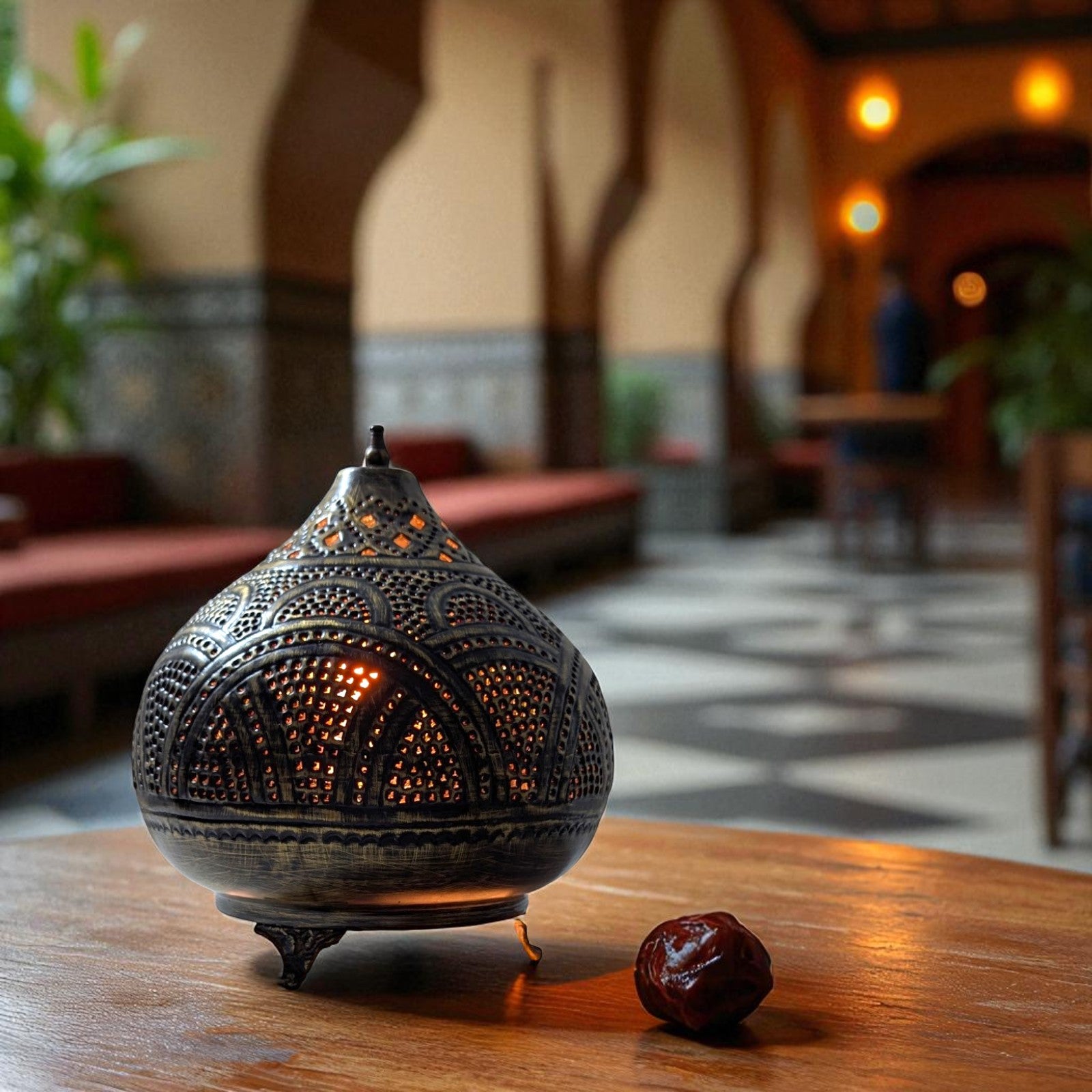 Illuminate your space with handcrafted elegance. This handmade antique-finish brass table lamp features an intricate Moroccan-arches filigree motif that has been finely hand-etched and hand-drilled across the entire body. When lit, the perforations cast beautiful, atmospheric patterns — perfect for living rooms, bedrooms, lounges or boutique displays.