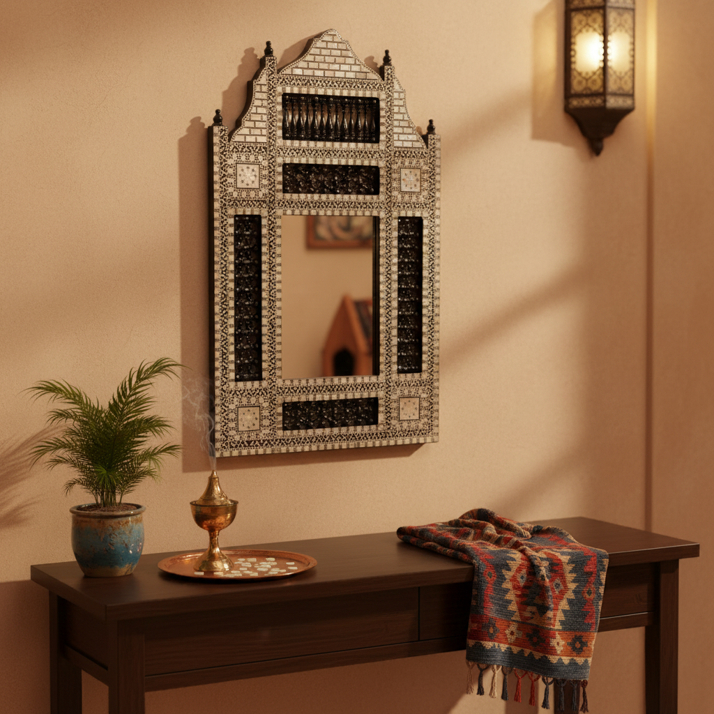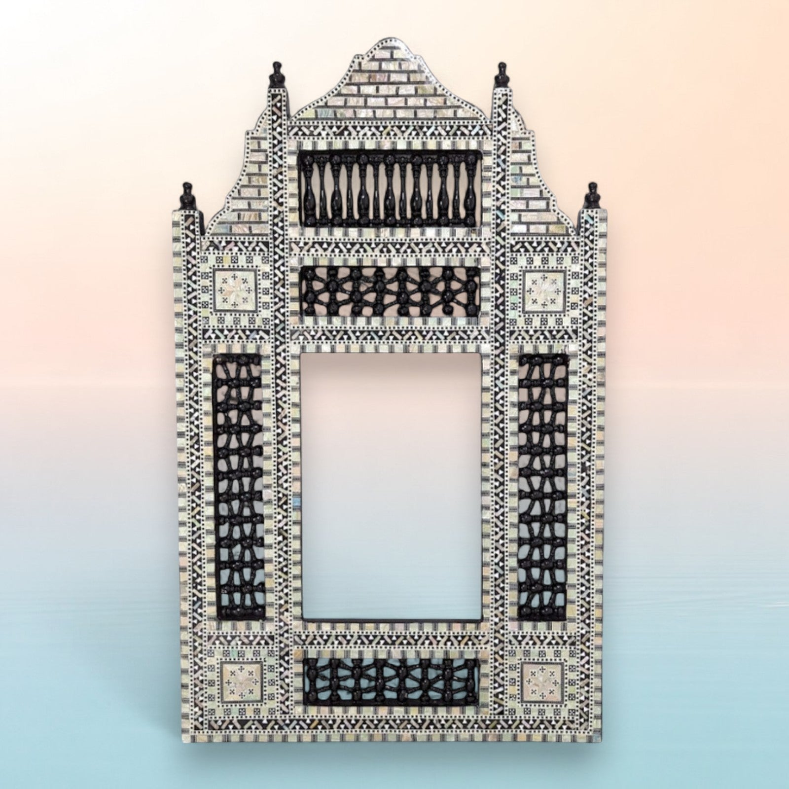 Up for sale, a beautiful Arabesque rectangular mother of pearl mirror frame. Arabesque is a classic Arabian/Islamic wood art. These tiny wood pieces are made one by one, each one is drilled, connected together to form these beautiful shapes. Made of wood. The face is all worked with fine cut pieces of mother of pearl together with artificial cuts. The frame is approximately 30" tall and 18.5" width. The mirror area is 11.8" X 7.8". To minimize shipping charge, I am offering the frame WITHOUT the mirror.